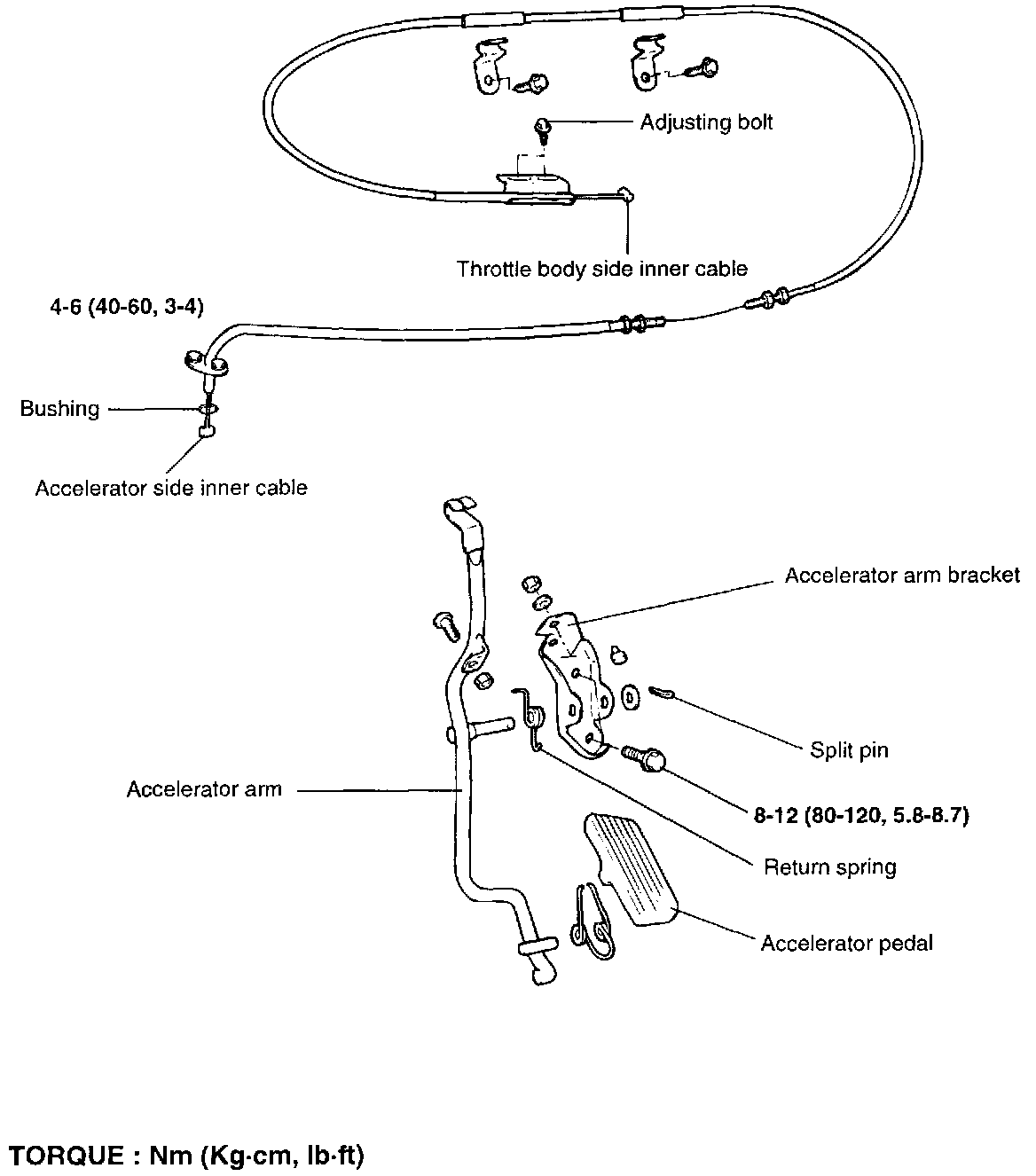 Accelerator arm bracket bolt torque: 8-12 Nm (6-7 ft.lbs.)