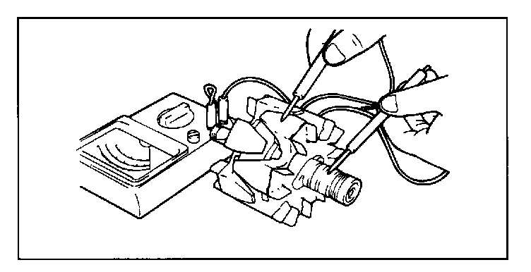 2. Check the rotor coil for a ground. Check that there is no continuity between slip the ring and the core. If there is continuity, replace rotor assembly.