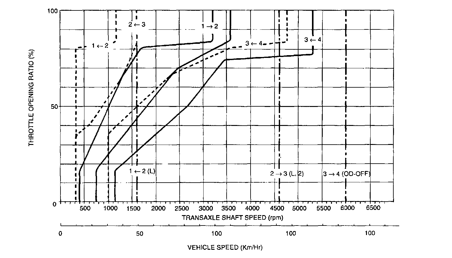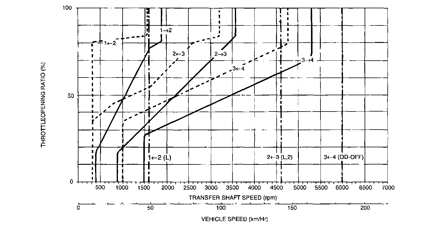 SHIFT PATTERNSTwo shift patterns are stored in the control module of the transaxle. One is the Power pattern (for more powerful performance), and the other is the normal pattern (for improved fuel consumption and quieter operation) (Refer to the diagram). The driver can switch to the desired pattern by using the Power/Normal select switch on the center console. The solid lines shown on these shift patterns graphics indicate up-shifts, and the broken lines indicate down-shifts is because up-shifts and downshifts will not occur when driving at a speed close to that of the shift point. When the vehicle is stopped, the transaxle is shifted into second gear in order to prevent vehicle 'creeping". Then when the accelerator pedal is depressed, the vehicle starts off in first gear.