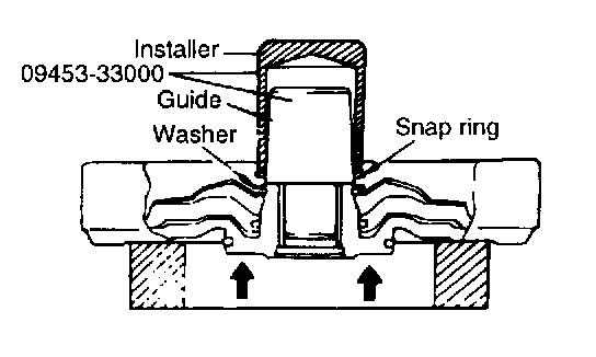 4. After fitting a new snap ring into the guide of the special tool snap-ring installer, install the retainer. Push the snap ring as far down on the guide as possible. Attach the installer and press until the snap ring enters the groove. Do not press more than necessary. The places indicated by arrows in the illustration (center projections) are not to be supported.