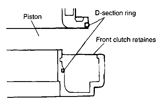 1. Install the D-ring in the groove on the outside surface of the piston with its round side out. Install another D-ring to the front clutch retainer.