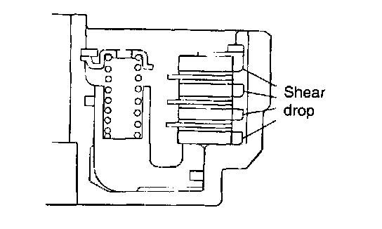 6. After installing the snap ring, check to see if there is a 0.8 - 1.0 mm (0.031 - 0.039 inch) clearance between the snap ring and the clutch reaction plate. To check clearance, hold the entire circumference of the clutch reaction plate down with 50 N (11 lbs.) force. If the clearance is out of specification, adjust by selecting the proper snap ring.