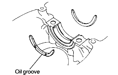 11. Install the thrust washers in the No. 3 main bearing cap with the oil grooves facing outward.