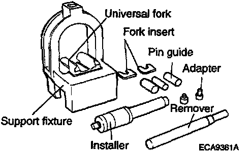 CAUTION: The pin guide centers the connecting rod in the piston. When the piston, connecting rod, piston pin and pin guide assembly are positioned on the fork of the tool, the pin guide will also center this assembly in the tool. If too small a pin guide used, the piston assembly will not be located centrally in the tool, and damage may occur to the fork and/or insert of the tool.