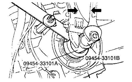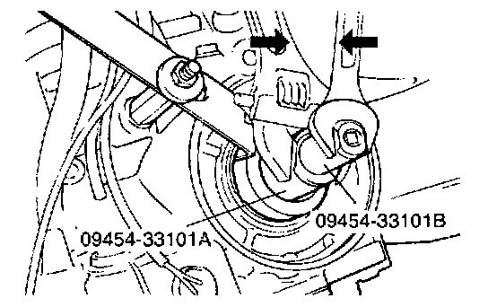 6. Fit torque wrench to special tool (09454-33101 B) and repeat tightening and lessening cycle two times with a torque of 10 Nm (7.2 ft. lbs. Then, torque to 5 Nm (3.6 ft. lbs.). Next, back off special tool (09454-33101B) 2 to 2 1/4 turns.