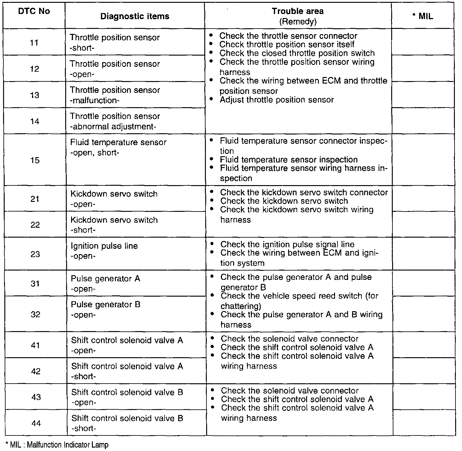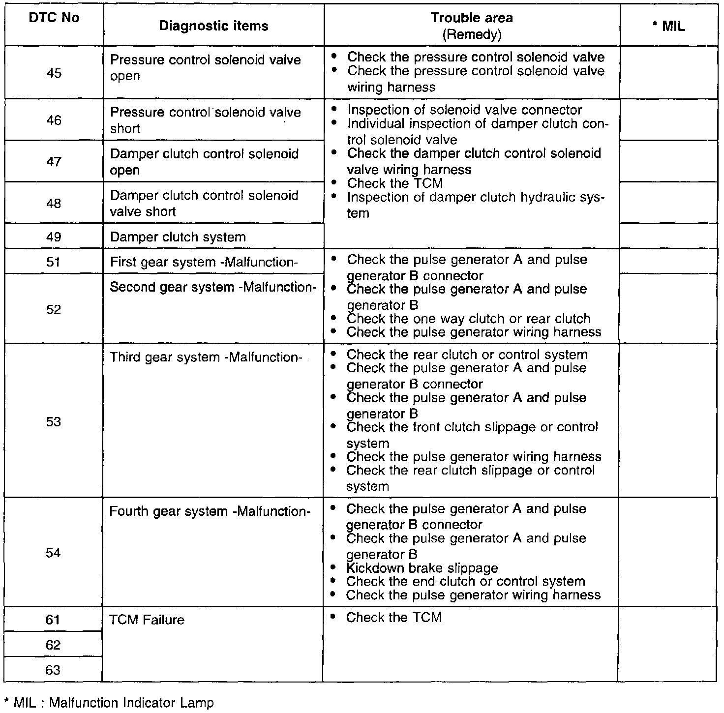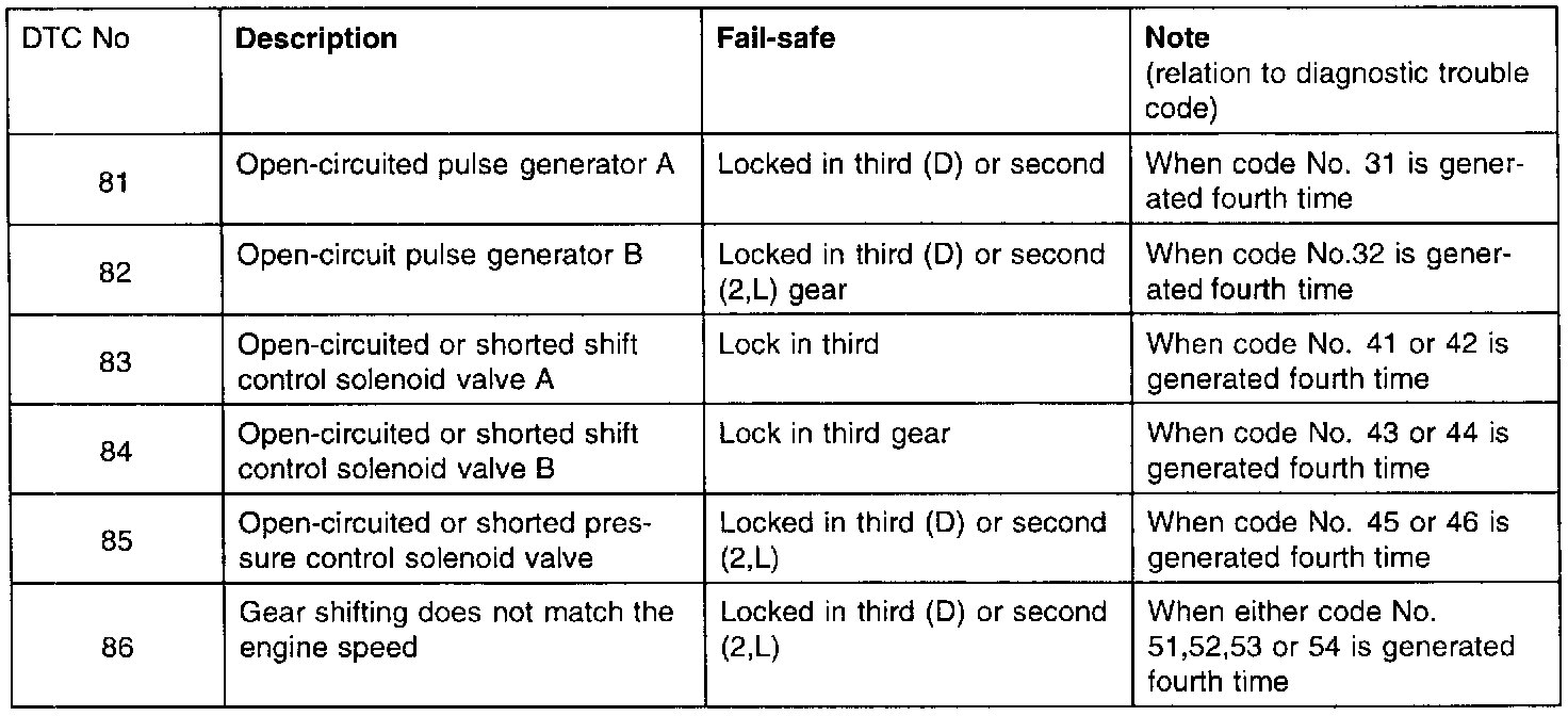 If the fail-safe system is activated and the transaxle is locked in third gear, the diagnostic trouble code in the Fail-Safe Code Description will be stored in the RAM. Three of these fault codes can be stored.
