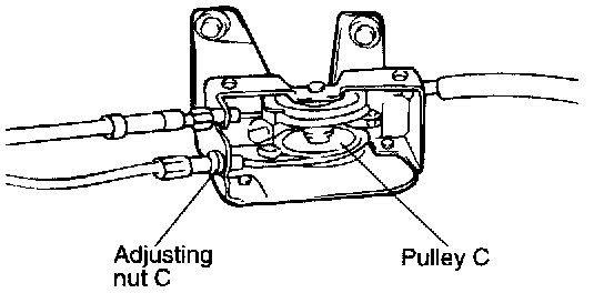 4. Rotate the intermediate pulley C in the direction shown in the diagram, and while keeping it touching the stopper, tighten the adjusting nut C in the direction to lessen the inner cable play of the accelerator cable. Then unscrew the adjusting nut C the specified number of turns just before the intermediate pulley C begins to move.