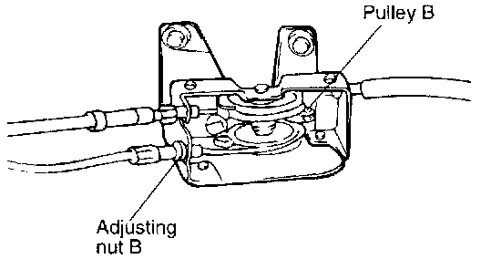 6. Tighten the adjusting nut B in the direction to lessen the inner cable play of the throttle cable. At the position where the intermediate pulley B lever touches the intermediate pulley C, unscrew the adjusting nut B the specified number of turns.
