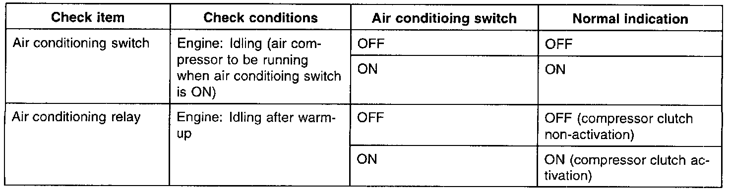 NOTE: If the air compressor magnetic clutch is not activated when the air conditioing switch is turned on during idling, faulty air conditioning control system is suspected.