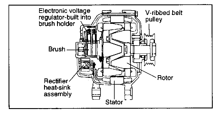 In addition, the charging voltage of this generator is regulator is regulated by the battery voltage detection system. The main components of the generator are the rotor, stator, rectifier, capacitor brushes, bearings and V-ribbed belt pulley. The brush holder contains a built-in electronic voltage regulator.