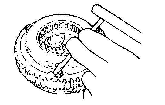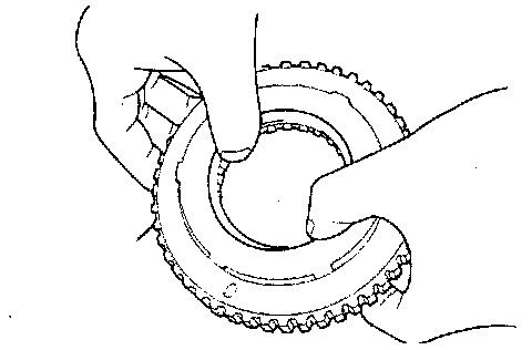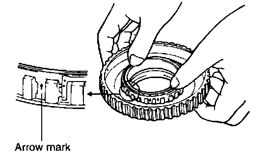 7. Press the overrunning clutch into outer race. Be sure that the arrow on the outside circumference of the cage is pointing upward as shown in the illustration when the overrunning clutch is installed.