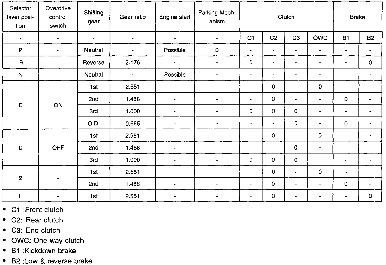 Element In Use at Each Selector Lever Position
