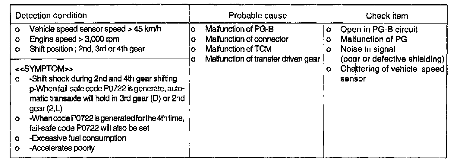 - If DTC P0722 is output 4 times, there is an open circuit in PG-B fail-safe code P0722 is output and the vehicle is locked in 3rd gear (D) or 2nd gear (2,L) as a fail-safe measure.