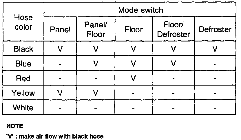 4. Check for vacuum hiss from the mode switch and vacuum hoses, and inspect for air flow between each hoses when the mode switch is at the each positions as shown.