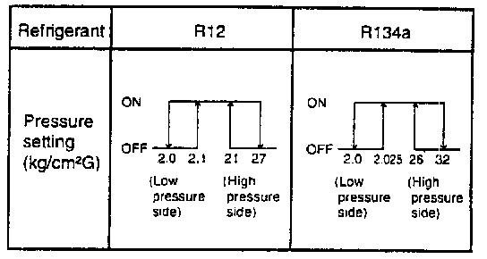 The dual pressure switch is a combination of the low pressure switch (for checking the quantity of refrigerant) and the high pressure switch (for prevention of overheating). It is installed in the receiver, and when the pressure becomes approximately 200 kPa (29 psi) or lower, the compressor stops, thus preventing the compressor from being damaged by heat. When the pressure reaches approximately 3,140 kPa (455 psi) or higher, the compressor stops, thus preventing overheating. There is generally no necessity for inspection; if, however, an unusual condition, such as non-operation of the compressor is encountered, check by following the procedures.