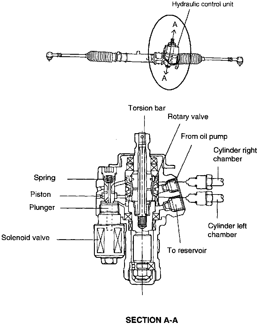 When the piston is pushed up, it closes the oil passing hole, therefore the power steering oil pressure is delivered into the cylinder without any interruption. But when the hole is opened as the piston is pulling down, some of the oil coming from the rotary valve is drained into reservoir via the hole inside the rotary valve.