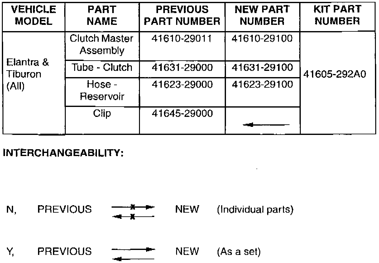 Beginning with October 14, 1997 production, Elantra and Tiburon models are equipped with a "G" type clutch master cylinder. The "G" type clutch master cylinder is interchangeable with the previous "N" type clutch master cylinder. This TSB provides interchangeability information.