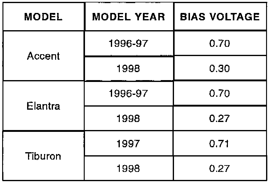 The oxygen sensor voltage offset (or bias voltage) observed when using the Hyundai Diagnostic System (HDS) has changed on 1998 Accent, Elantra & Tiburon from the value of previous model years. The oxygen sensor voltage offset is 0.27 volts for 1998 Elantra and Tiburon, and 0.30 volts for 1998 Accent.