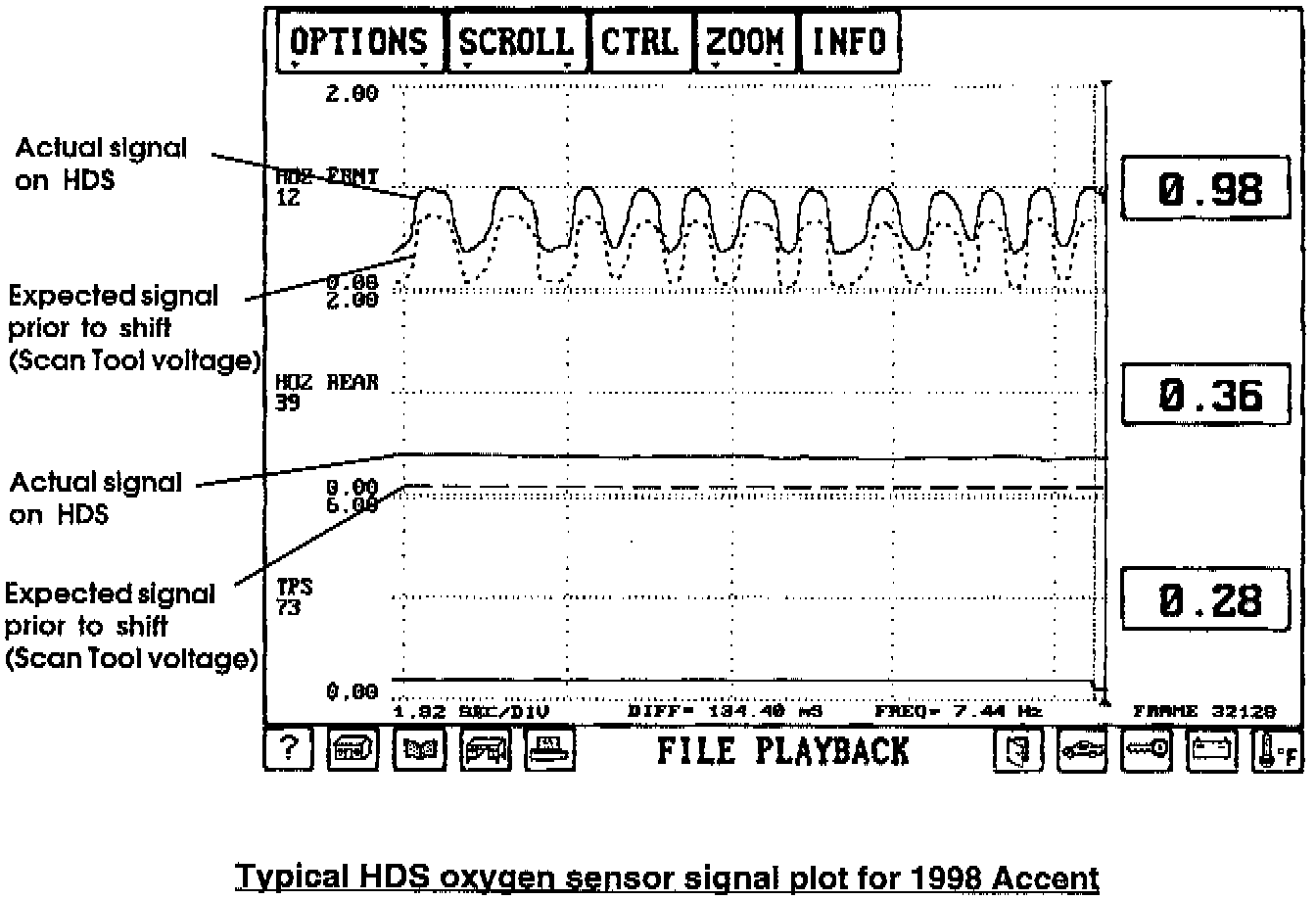 When the HDS is used to monitor oxygen sensor signals on 1996 and 1997 Accent & Elantra and 1997 Tiburon vehicles, a 0.70 V (0.71 V for Tiburon) signal offset is observed, This shifts the sensor readings 0.70 V (0.71 V for Tiburon) higher so the new signal range is 0.70 V to 1.70 V (0.71 V to 1.71 V for Tiburon). This shift is seen only when using the HDS machine because the sensor signal is read before it is processed (filtered) by the powertrain control module (PCM) (this offset is not present when using the Scan Tool). The offset has no affect on the sensor signal appearance or frequency.