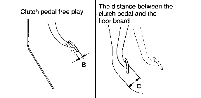 3. After completing the adjustments, check that the clutch pedal free play (measured at the face of the pedal pad)and the distance between the clutch pedal (the face of the pedal pad) and the floor board when the clutch is disengaged, are within the standard value ranges.