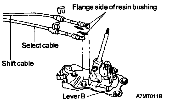 3) The flange side of the resin bushing at the select cable end should be at the lever (B) end surface.