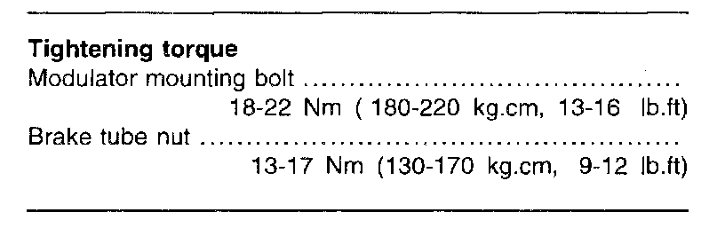 Modulator mounting bolt 18-22 Nm (180-220 kg. cm, 13-16 ft. lbs.)
