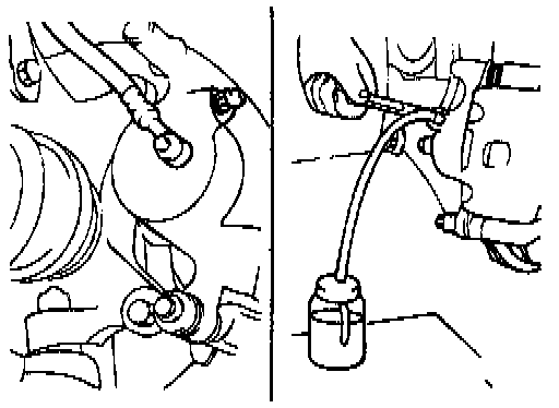 3. Connect a vinyl tube to the wheel cylinder bleeder screw and insert the other end of tube in a half full container of brake fluid.