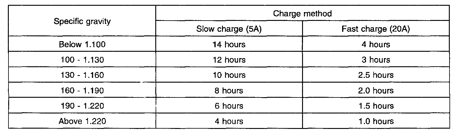 A fully charged battery should have a specific gravity between 1.260 and 1.280, with the electrolyte temperature at 80° F. The specific gravity reading must be corrected by adding 4 points (0.004) for each 10° F above 80°F or subtracting 4 points for every 10° F below 80° F.