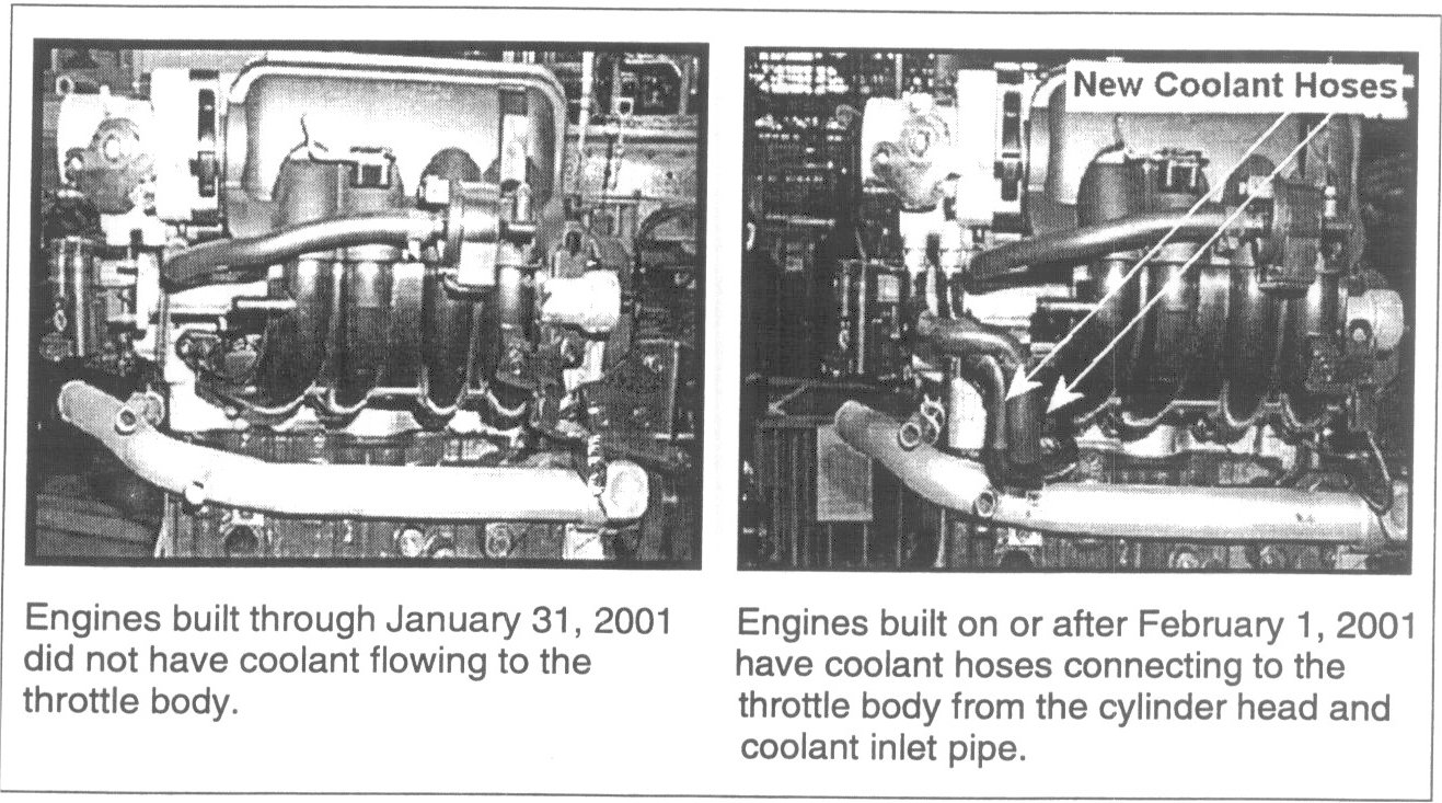The throttle body can be installed on vehicles produced through January 31, 2001. If Campaign 047 has not been performed, do not connect any hoses to the 2 coolant nipples.