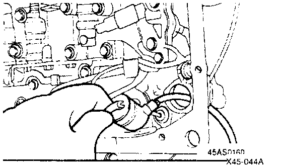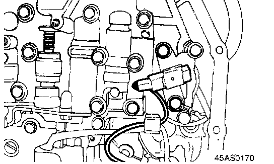 10. Install the valve body assembly to the case and then insert the solenoid valve connector into the case. Be sure, at this time, that the notched part of the connector faces as shown in the figure. Also be careful that the lead wiring isn't caught.