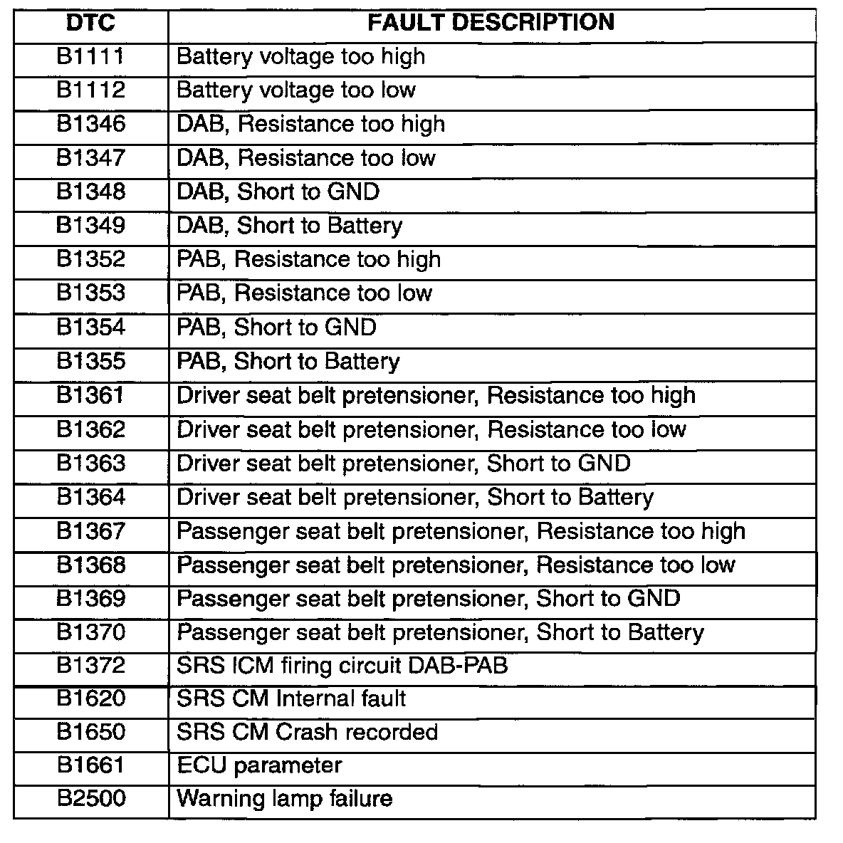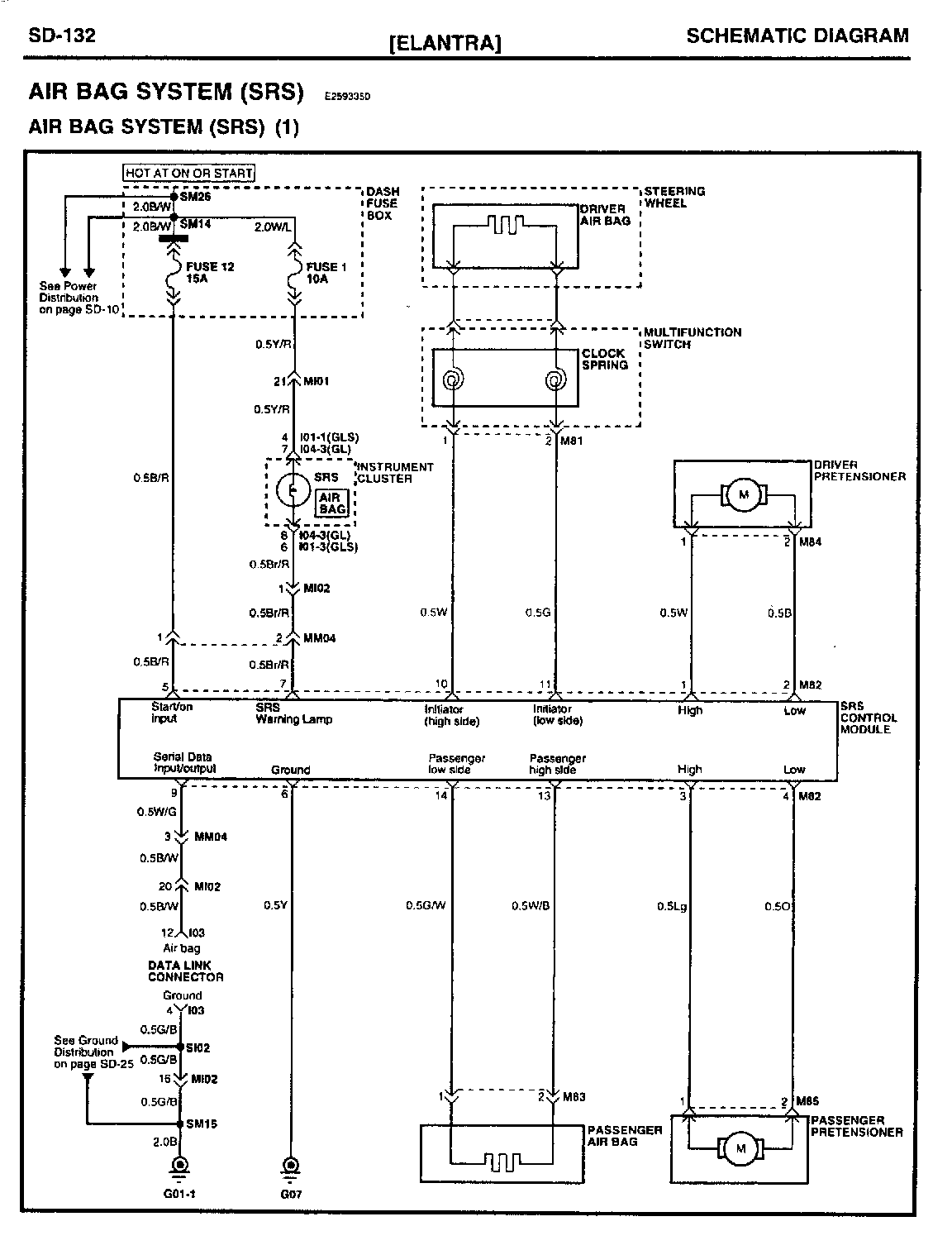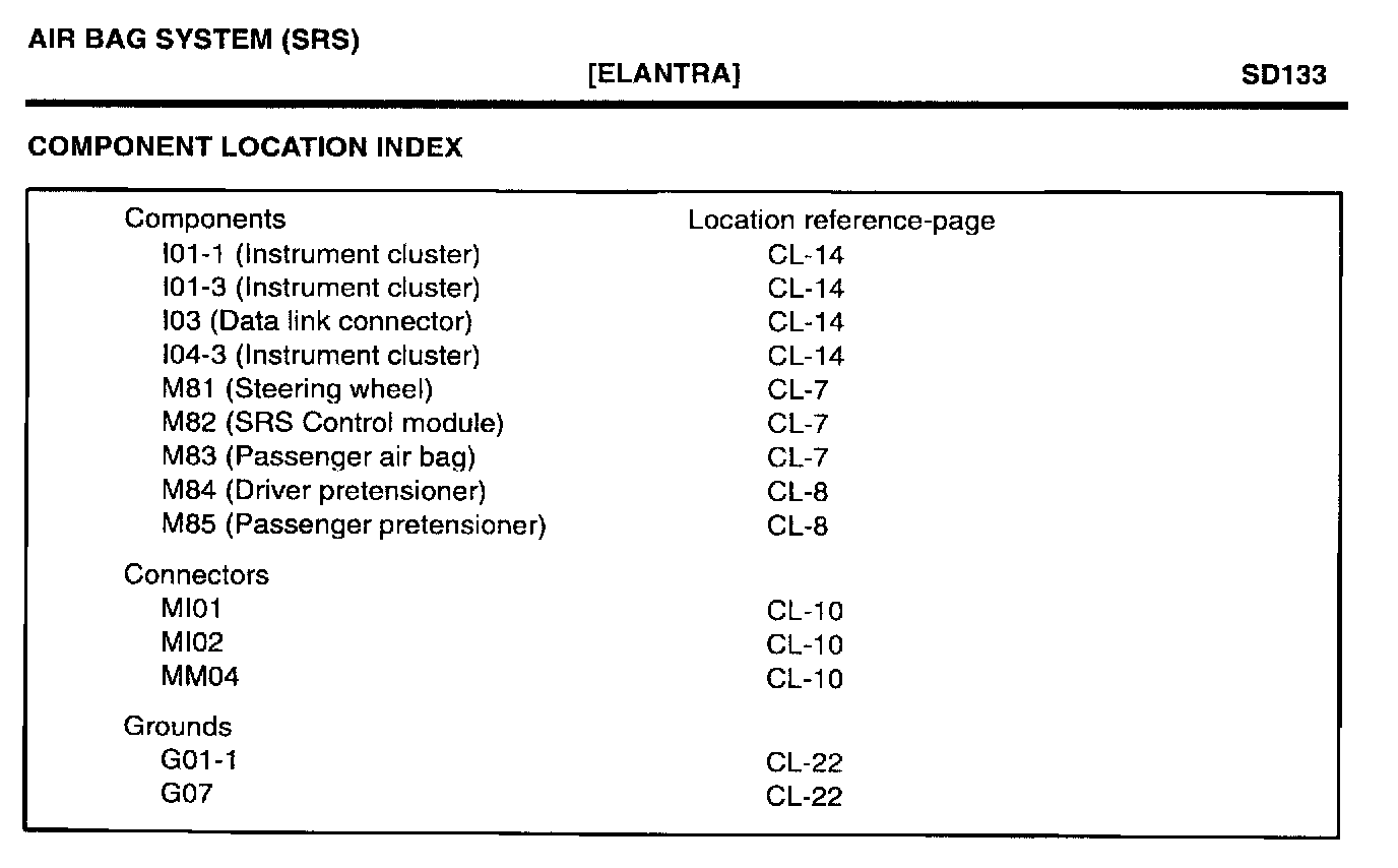 The 1999 Elantra is equipped with an Air Bag System (SRS) and seat belt pretensioners. This TSB provides diagnostic trouble codes (DTC), a wiring schematic which includes the pretensioner circuits and a component location index.