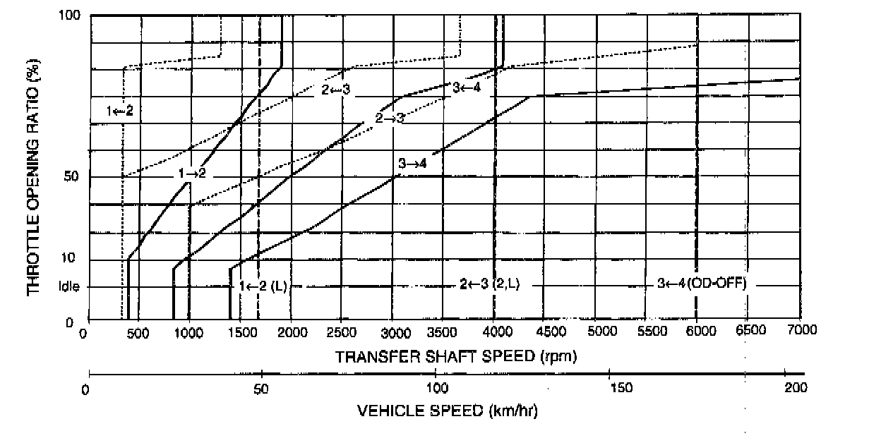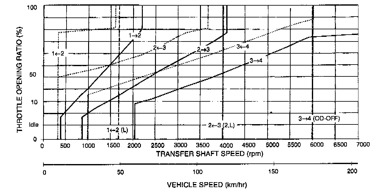 The solid lines shown in these shift patterns indicate up-shifts, and the broken lines indicate down-shifts. The reason why there is a difference between the shift points for up-shifts and for down-shifts is so that up-shifts and down-shifts will not occur intermittently when driving at a speed close to that of the shift point.