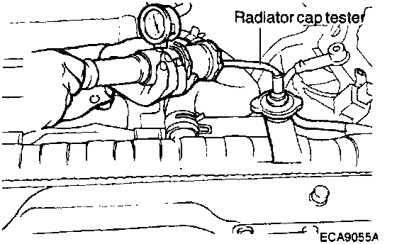 3. Install a radiator cap tester to the radiator filler neck and apply 150 kPa (21 psi, 1.53 kg/cm2) pressure. Hold for two minutes in that condition, while checking for leakage from the radiator, hose or connections.