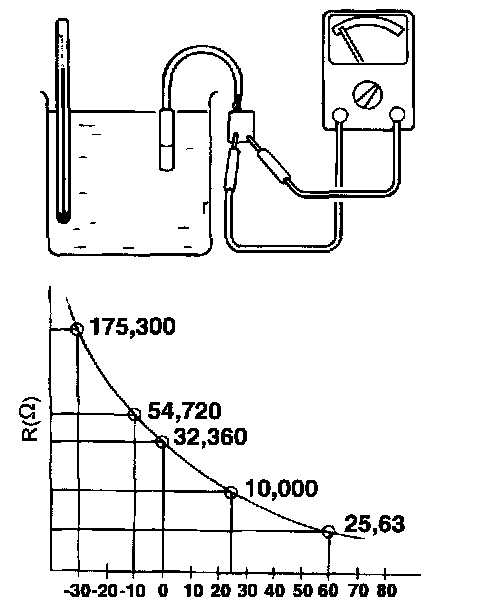 1. Immerse the water temp. sensor in water.2. Using a stove heating the water measure the resistance between terminal 1 and terminal 2.