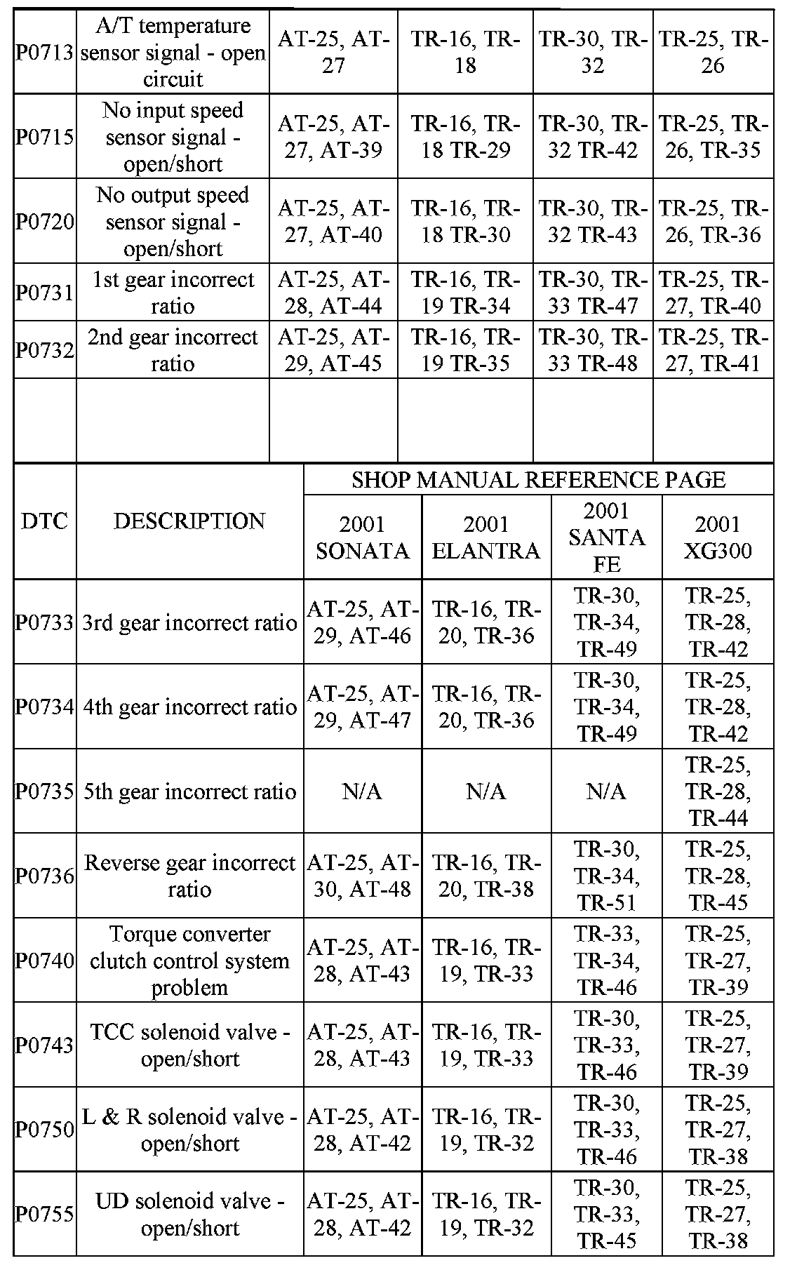 SONATA, ELANTRA, SANTA FE, XG300 TRANSAXLE DIAGNOSTIC TROUBLE CODES