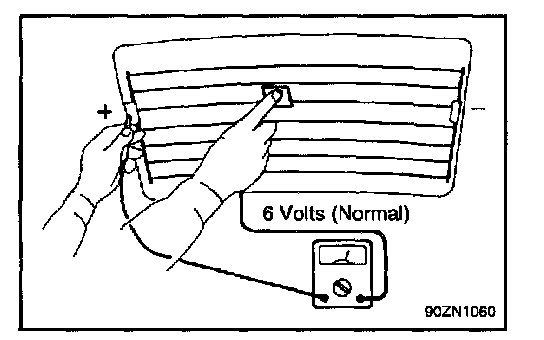 1. Turn on the defogger switch and use a voltmeter to measure the voltage of each heater line at the glass center point. If a voltage of approximately 6V is indicated by the voltmeter, the heater line of the rear window is considered satisfactory.