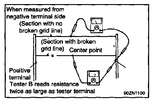 5. Use an ohmmeter to measure the resistance of each heater line between a terminal and the center of a grid line and between the same terminal and the center of one adjacent heater line after another with defogger OFF. The section involving a broken heater line indicates resistance twice as that in other section. In the affected section, move the test lead to a position where resistance sharply changes.
