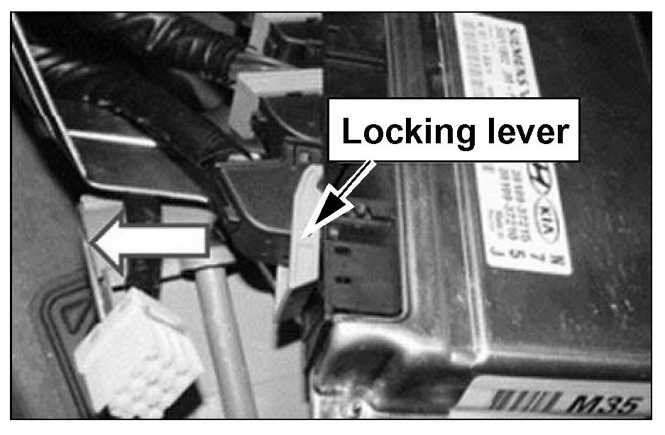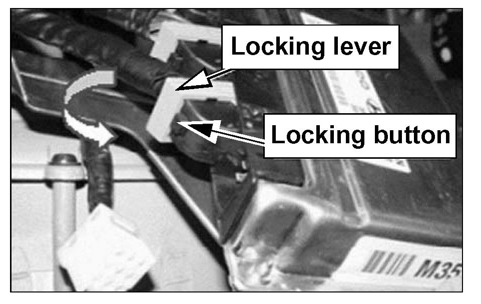 8. Lower each ECM connector cover locking lever after pressing down the locking button as shown.