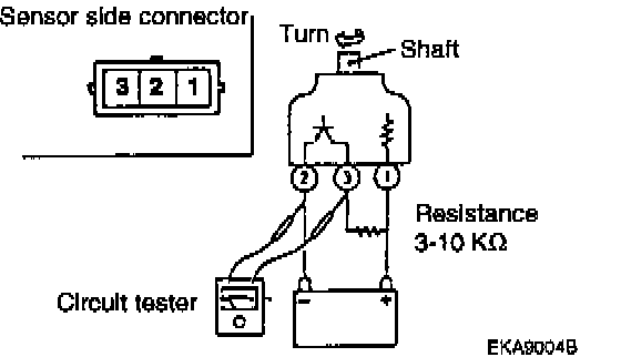 The TP Sensor is a variable resistor type that rotates with the throttle body shaft to sense the throttle valve angle. As the throttle shaft rotates, the output voltage of the TP Sensor changes. The ECM detects the throttle valve opening based on voltage change.