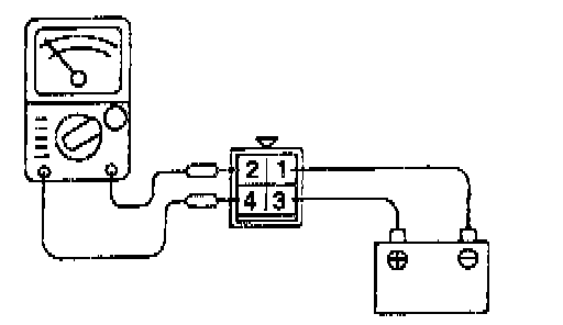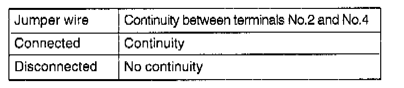 3. Check the continuity between terminal (2) and terminal (4) of the A/T control relay when the jumper wires are connected to and disconnected from the battery.