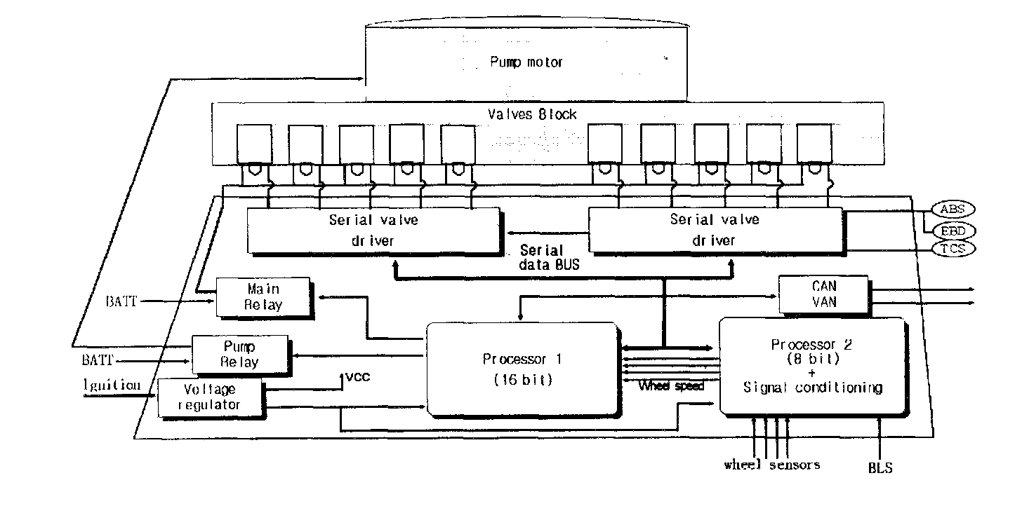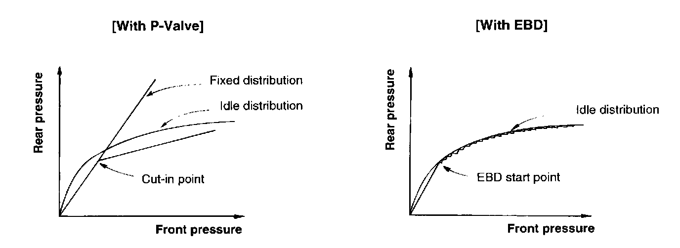 The EBD is additionally applied instead of the proportioning valve to make the ideal distribution of a fluid pressure to the front and rear brake to prevent the brakes from skidding in the event of rearwheel lock and to obtain a higher brake efficiency within the range of service brake application.