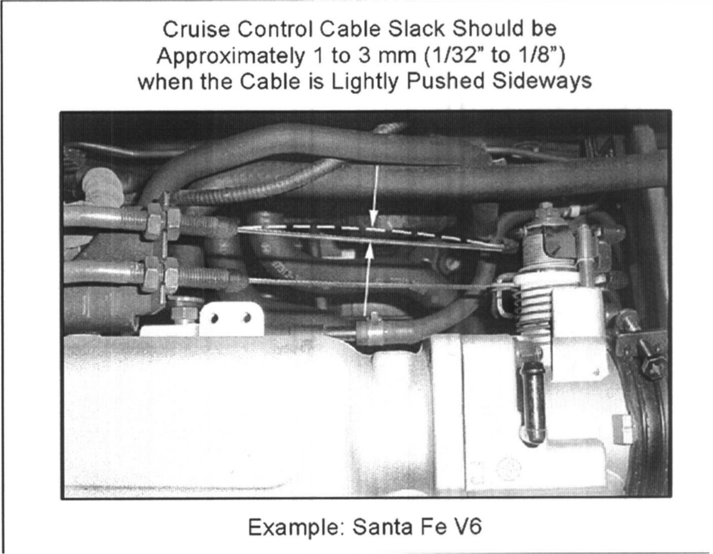 There should be approximately 1 to 3 mm (1/32" to 1/8") of slack when the cable is pushed sideways lightly (see the picture shown). RESET THE TPS ADAPTATION VALUE by using the Hi-Scan Pro. In the Hyundai Diagnostic Engine Menu, there is an option (typically # 10) for "RESETTING ADAPTIVE VALUES" . Do NOT disconnect the battery power. This will cause the Readiness Monitors to be reset as-well-as any TCM adaptation values.