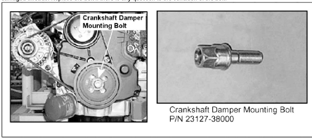 * = Before re-using a crankshaft damper mounting bolt, inspect the bolt for pitting, corrosion and damaged threads. Replace the bolt if there is any question to the condition of the bolt.