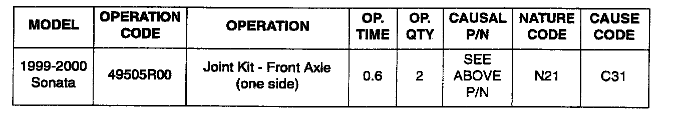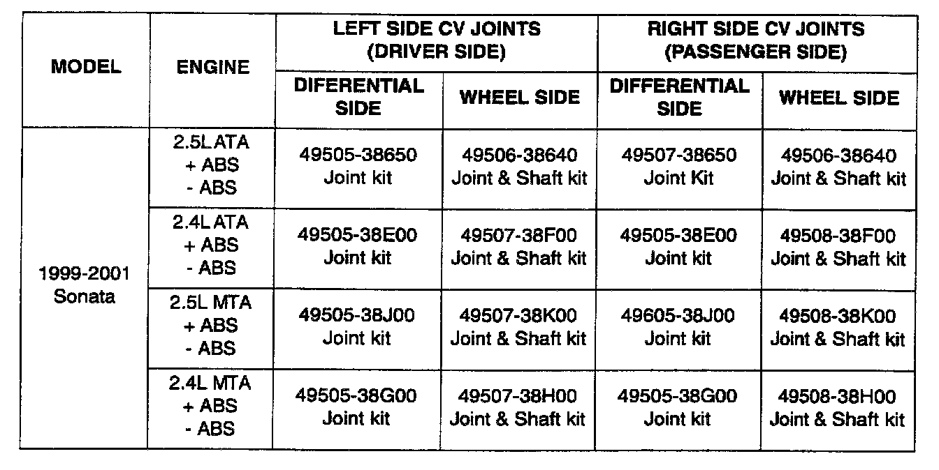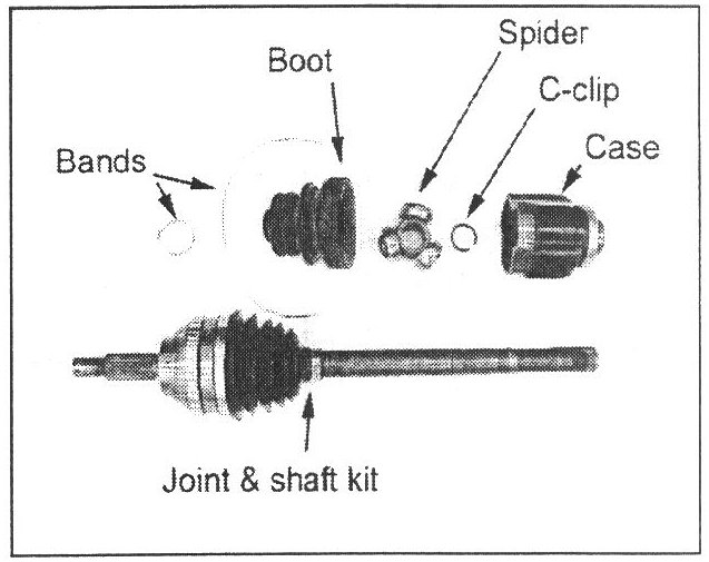 1. Remove the drive shaft according to the 1999 or 2000 Sonata Shop Manual, Page DS-8. Assemble the new driveshaft as shown in Steps 2-6.