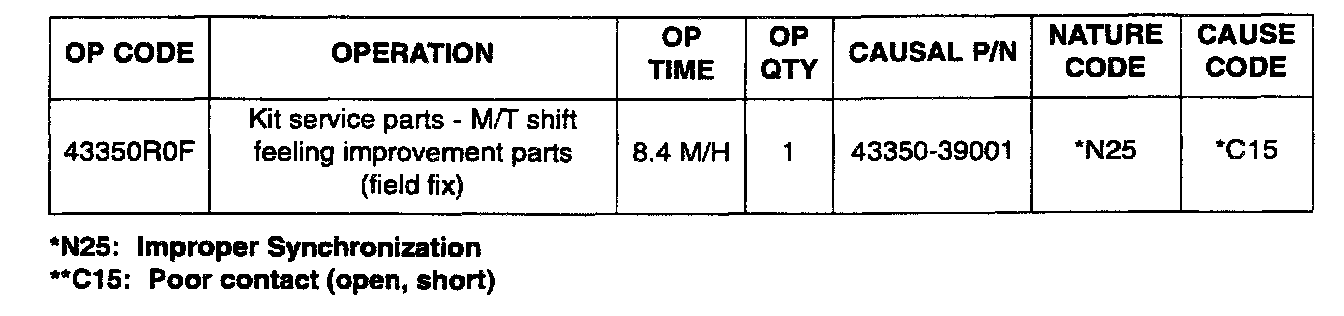 To improve a hard shift feeling when shifting into 1st or 2nd gear, a triple cone synchronizer assembly has been made available to replace the single and double cone synchronizer assemblies installed in the 1999 and 2000 Sonata manual transaxles.