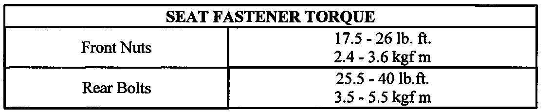 3. Tighten the four fasteners to the appropriate torque values and recheck the seat operation. Repeat step 2 if necessary.
