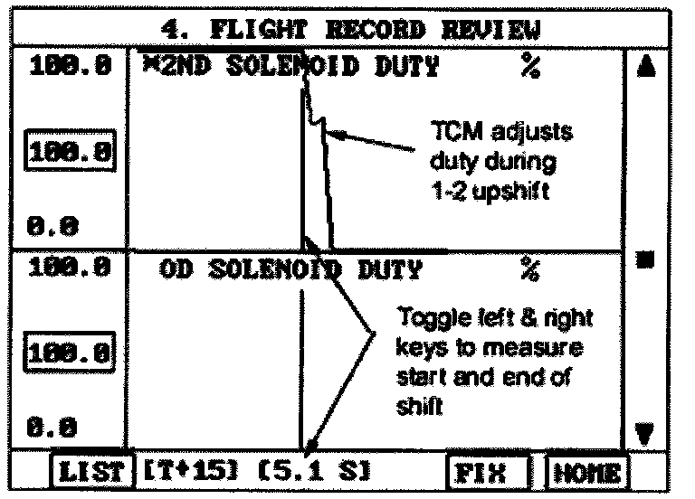 Toggle the left and right keys to measure the start and end of each shift, then subtract the two numbers. If any shift requires more than 2.0 seconds, swap a TCM from a properly operating vehicle: