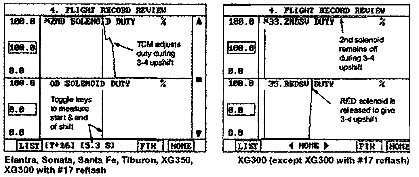 Repeat for the 3-4 upshift (for XG300, select "2nd Solenoid Duty" and "RED Solenoid Duty"). Accelerate vehicle 3-4, then F6 "END".