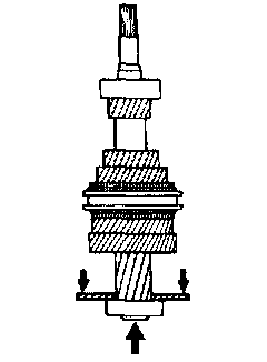 2. Remove the stopper snap ring, snap ring, 5thand 4th speed gear, needle roller bearing, 4th speed gear sleeve, synchronizer ring (3rd & 4th), synchronizer spring (1st, 2nd, 3rd, 4th), synchronizer sleeve (3rd & 4th), 3rd speed gear and needle roller bearing.