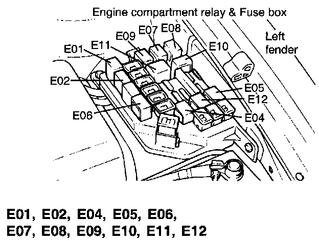 E01 Head Lamp Relay (HIGH), E02 DRL Relay, E04 Start Relay, E05 Condenser Fan Relay, E06 Head Lamp Relay (LOW), E07 Radiator Fan Relay, E08 A/C Relay, E09 Front Fog Lamp Relay, E10 Tail Lamp Relay, E11 Blower Relay, E12 Horn Relay: